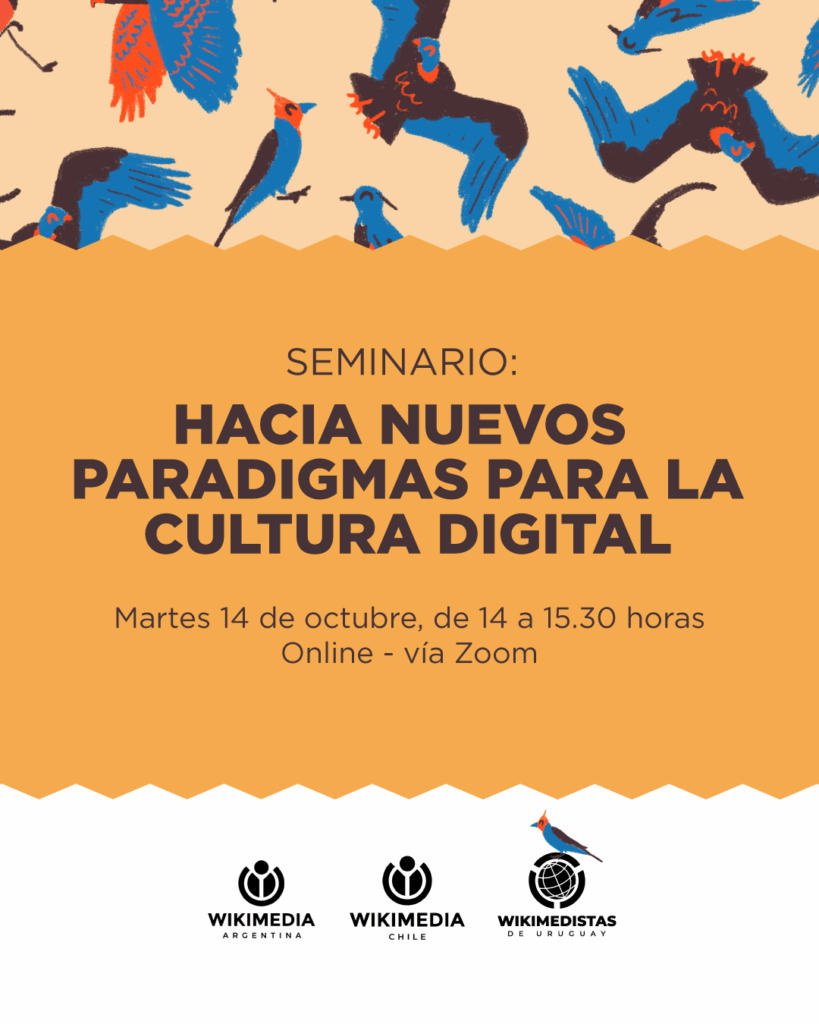 Wikimedia Argentina, Wikimedia Chile y Wikimedistas de Uruguay invitan al seminario participativo “Hacia nuevos paradigmas para la cultura digital” el día 14 de octubre a las 14h.